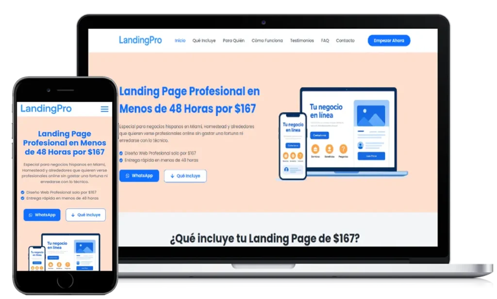 Creo páginas web profesionales y fáciles de usar para emprendedores hispanos. Te atiendo en español, trabajo con negocios en todo Estados Unidos y te acompaño en cada paso.